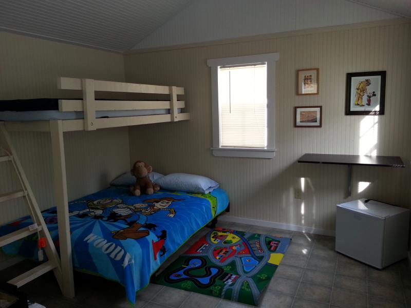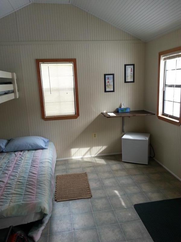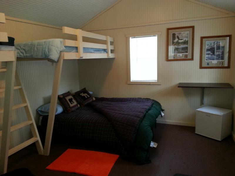Amenities: Small refrigerator, A/C, 2 queen beds, 2 single bunk beds.
